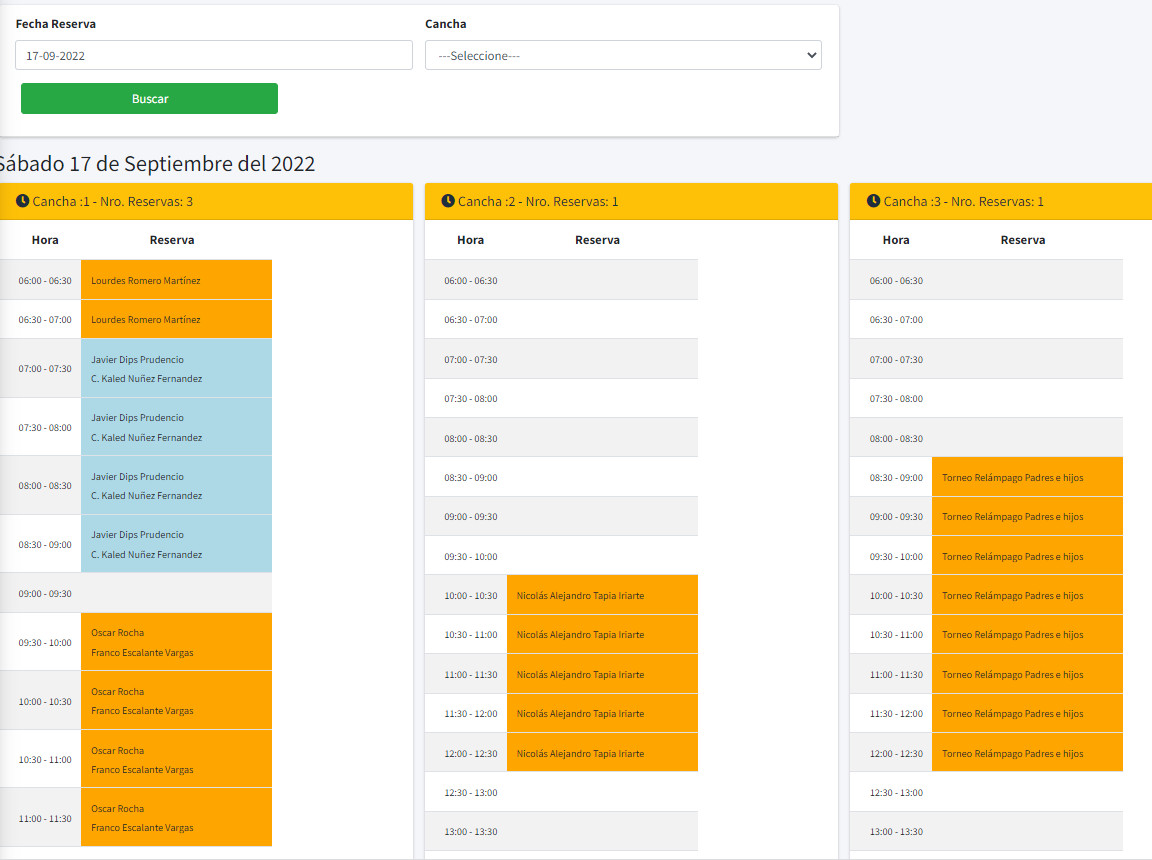 - Configuración de reservas especiales: feriados o uso de canchas para un torneo específico.